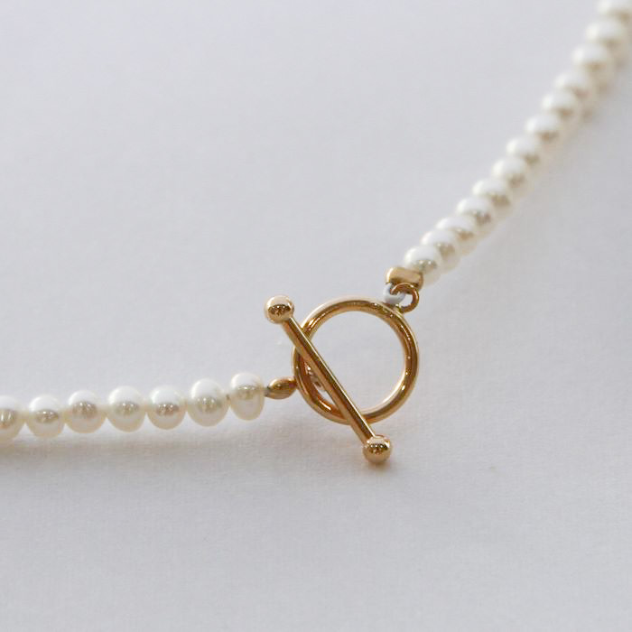 <K18 Little mermaid babypearl toggle bracelet> (リトルマーメイドベビーパールトグルブレスレット) 小粒で可愛らしい淡水パールをK18ゴールドトグルクラスプ仕様にお仕立てしました。 可憐で純粋な印象のパールとK18ゴールドとの組み合わせが大人可愛い印象です。 シャツやワンピースなどのかっちりしたスタイルから、Tシャツなどのカジュアルスタイル、 また結婚式などのパーティーシーンまで幅広くお使いいいただけます。 女性の美を象徴する宝石でもある真珠。 また6月の誕生石でもある真珠はバースデーギフトとしてもおすすめです! |