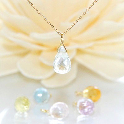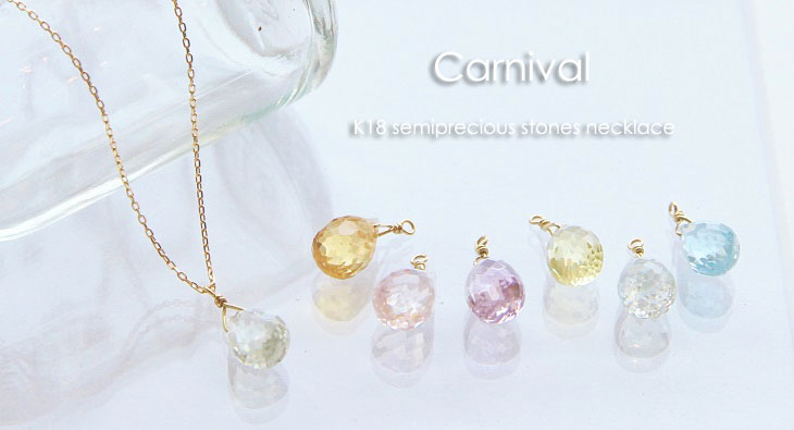 <Carnival semiprecious stone pendant necklace> カーニバルセミプレシャスストーンペンダントネックレス 見ているだけでワクワクするようなシャーベットカラーの天然石。 レモンクォーツ、ローズクォーツ、アメジスト、グリーンアメジスト、シトリン、ブルートパーズ。 しずく型のストーンには細かいカットが施されているので、石そのものが放つ光を最大限に演出。 ストーンにレーザーで穴を開け、繊細な印象を邪魔しない細いK18金線でシンプルにお留めしたデザインは、まさに宝石職人の「匠の技」が光る一品です。 繊細で華奢なチェーンとほんのり色づいたストーンの組み合わせは、まとうだけで女性らしさが引き立ちます。 シンプルだからこそ、スタイリングを邪魔しない。オフィススタイルにもラフなデイリースタイルにも重宝してくれますよ。 |