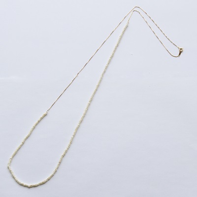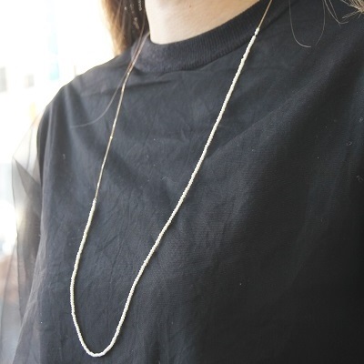 <K18 Neige waterpearl atymmetry long necklace> (ネイジュ淡水パールアシンメトリーロングネックレス) K18ゴールド小豆チェーンと小粒の淡水パールをアシンメトリーに組み合わせた、ロングネックレス。 シンプルなお洋服や無地のワンピースにさらりと1本身に付けるだけでおしゃれな印象に♪ 華奢な印象のチェーンと小粒のパールがスッキリと、シャープに魅せてくれます。 入学式や卒業式、結婚式のお呼ばれスタイルにもおすすめです♪ |