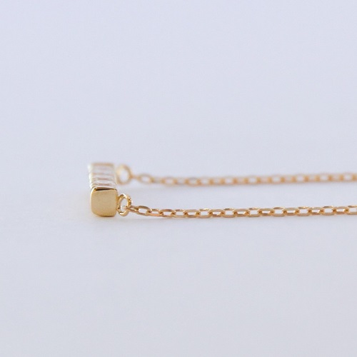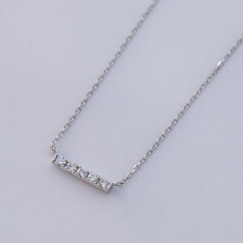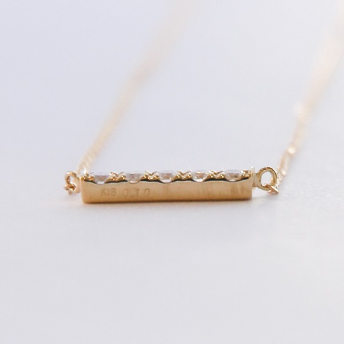 <K18 Déesse diamond pendant necklace/0.10ct> (ディーズダイヤモンドペンダントネックレス) デコルテラインにキラキラとゴージャスな輝きを放つ、 バータイプのペンダントネックレス。 華奢な中にもしっかりとダイヤモンドの輝きが感じられ、程よい存在感です。 ダイヤモンドを留めているバーにもしっかりと厚みを持たせているので、 しっかりと高級感も感じられます。 |