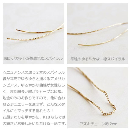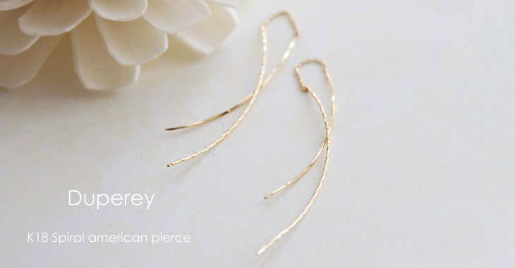 | <Duperey spiral american pierce> デュプレ―スパイラルアメリカンピアス ニュアンスの違う2本のスパイラル線が、耳元でゆらゆらと揺れる、大人シンプルなK18アメリカンピアス。 細かいカットが施されたスパイラルと、ゆるやかな曲線の平線スパイラルが、らせん状にゆらゆらと揺れ、光の反射でキラキラと輝きます。 ゆらゆらと揺れるスパイラルがお顔まわりを華やかに、ショートヘアーや、暑い季節のアップスタイルのアクセントに重宝すること間違いなし! スタイリングのアクセントに品良く輝く、上質なK18ならではの輝きがお楽しみいただける一品です。 |
