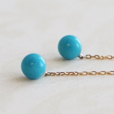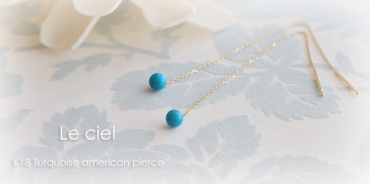 | <Le ciel turquoise american pierce> ル・シエルターコイズアメリカンピアス 4.0mm珠のターコイズ(トルコ石)を一粒、アメリカンピアスの先にセッティング。 鮮やかなスカイブルーの美しいターコイズが耳元でゆらゆらと揺れる、大人可愛いピアスに仕上がりました。 はつらつとした爽やかな印象のスカイブルーが思わず目に飛び込んでくる、存在感抜群のピアスです。 旅のお守りや、災から身を 守るお守りとして身につけられて身につけられているターコイズ、また12月の誕生石でもあるターコイズ。バースデーギフトとしてもおすすめです! |