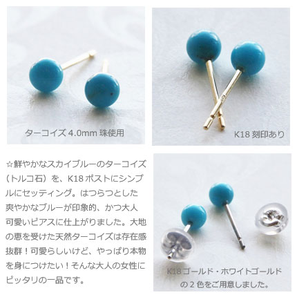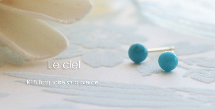 | <Le ciel turquoise stud pierce> ル・シエルターコイズスタッドピアス 鮮やかなスカイブルーのターコイズ(トルコ石)を、K18ポストにシンプルにセッティング。 はつらつとした爽やかなブルーが印象的、かつ大人可愛いピアスに仕上がりました。 大地の恵を受けた天然ターコイズは存在感抜群! 可愛らしいけど、やっぱり本物を身につけたい!そんな大人の女性にピッタリの一品です。 旅のお守りや、災から身を 守るお守りとして身につけられて身につけられているターコイズ、また12月の誕生石でもあるターコイズ。バースデーギフトとしてもおすすめです! |