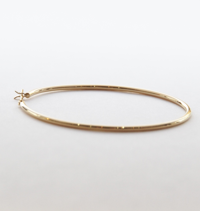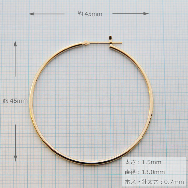 <K18 Pipe hoop pierce/45mm> 定番シンプルなパイプフープピアス。 こちらは定番大きめサイズの直径45mm。 しっかりと存在感を感じられるサイズ感です。 中が空洞になっているので軽く、またポスト針仕様のため、着脱も簡単♪ 後ろは一体型のキャッチになっているので、しっかり留まります。 K18ならではの上品な輝きがお楽しみいただける一品です。 |
