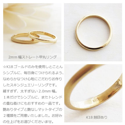 | <Duperey simple straight ring/K18 gold> デュプレーシンプルストレートリング シンプルなストレートの甲丸リング。K18ゴールドのみを使用し、とことんシンプルに、毎日身につけられるよう、なめらかなつけ心地にとことんこだわりお作りしたスキンジュエリーリングです。 細すぎず、太すぎない2.0mm幅。1本だけでシンプルに、また、トレンドの重ね着けにもおすすめの一品です。 ぜひ、つけ心地の良さを実感してみてください! |