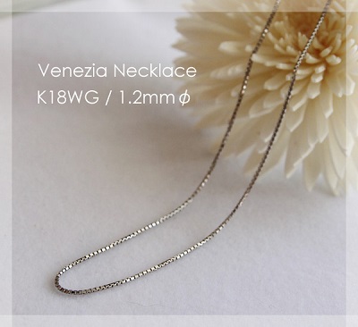 <K18WG ベネチアチェーンネックレス(1.2φ×1.2mm幅)> 定番のチェーンネックレス【ベネチア】 定番人気のベネチアチェーン。ダイヤモンドやストーンの輝きを邪魔することのないシンプルなデザインです。 36cm~80cmからご希望の長さをお選びくださいませ。 長さ調節が可能なアジャスター丸カンの取り付けも選択可能です。 当店のチェーンネックレスは、安心・安全な日本製です。 上質な素材をお求めやすい価格にて、品揃え豊富にご紹介させていただきます。 |